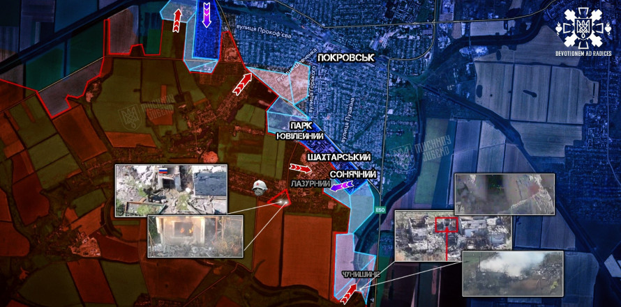 Мікрорайони «Шахтарський» і «Сонячний» залишаються гарячими точками — йдуть позиційні бої буквально за кожен метр. Разом із цим спостерігається посилення активності ворога в напрямку мікрорайону «Лазурний». Туди стягуються додаткові штурмові групи, артилерія працює системно, будинок за будинком — сектор фактично повністю у червоній зоні.