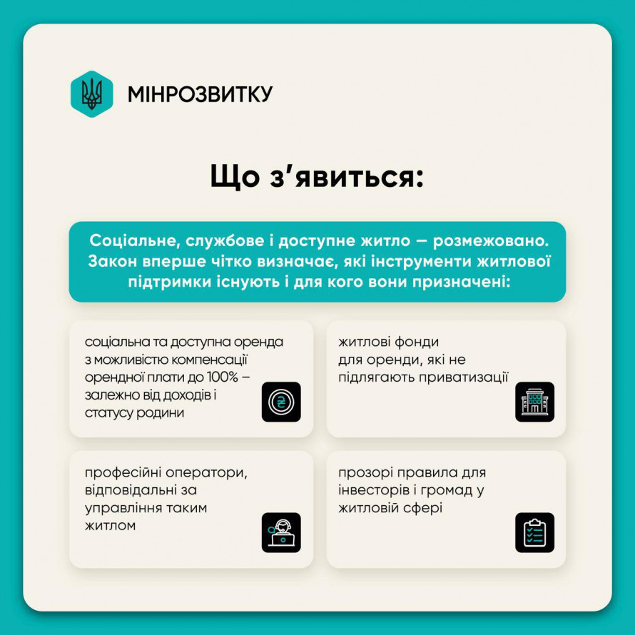 Соціальне, службове і доступне житло — розмежовано. Закон вперше чітко визначає, які інструменти житлової підтримки існують і для кого вони призначені. Йдеться про: