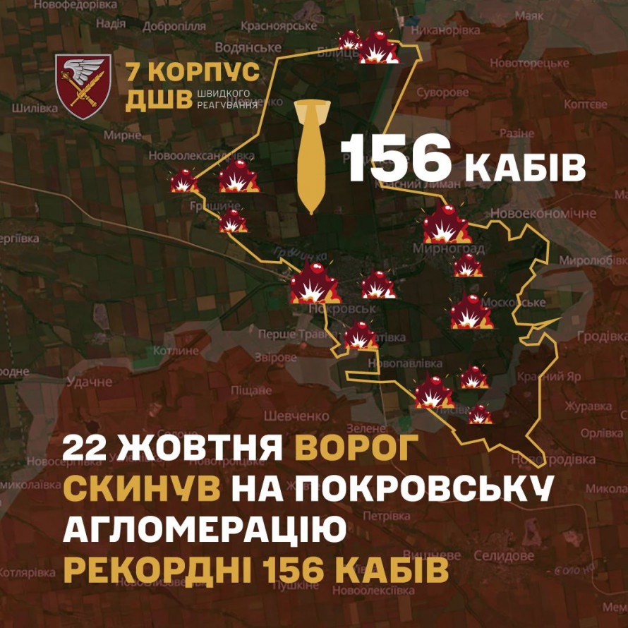 Загалом з початку жовтня ворог атакував Покровську агломерацію тактичною авіацією 215 разів, скинувши 860 КАБів по 250 кг кожна.