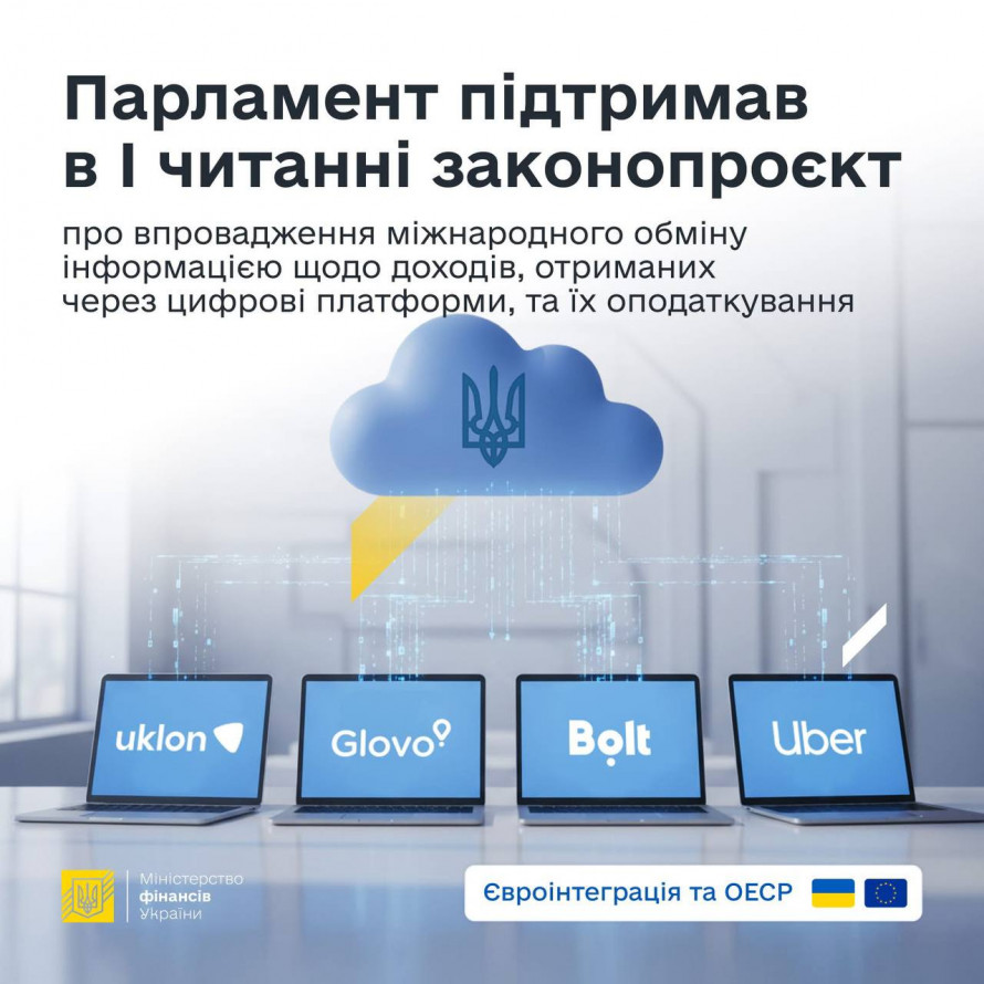 Верховна Рада України прийняла в першому читанні (за основу) законопроект «Про внесення змін до Податкового кодексу України та інших законодавчих актів України щодо впровадження міжнародного автоматичного обміну інформацією про доходи, отримані через цифрові платформи, та оподаткування таких доходів» (реєстр. № 15111-д).