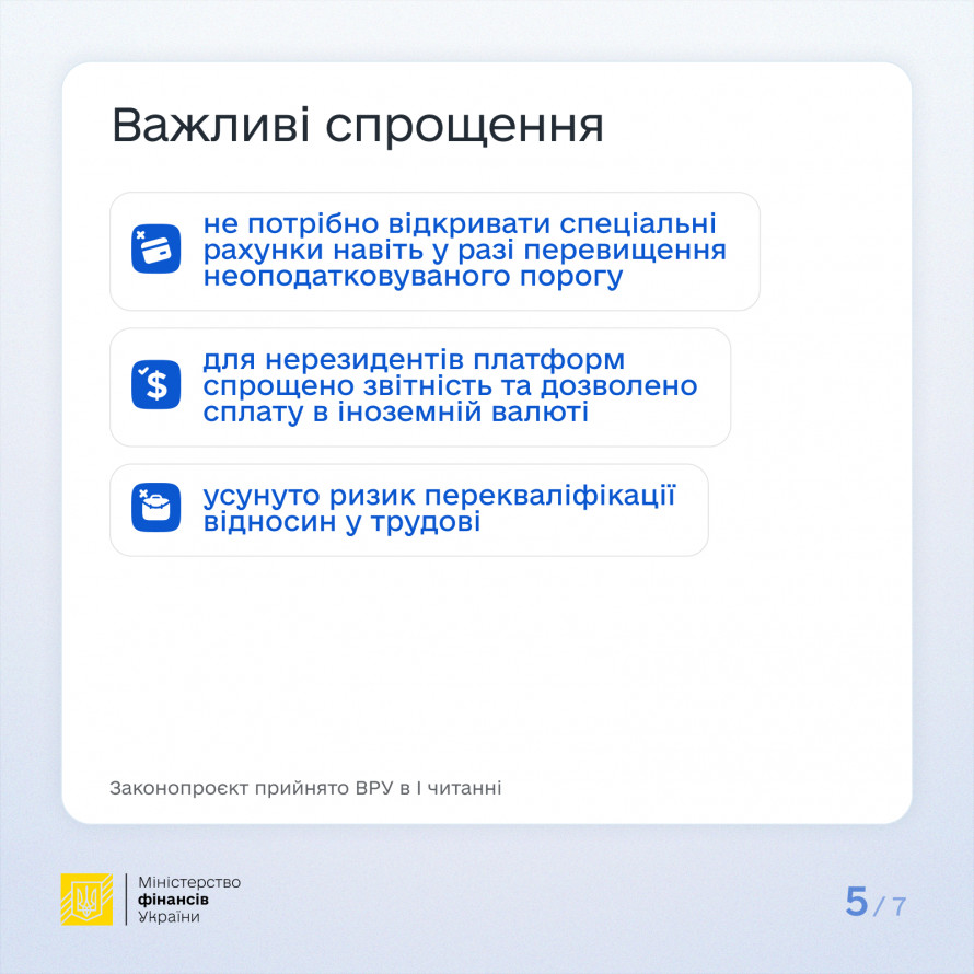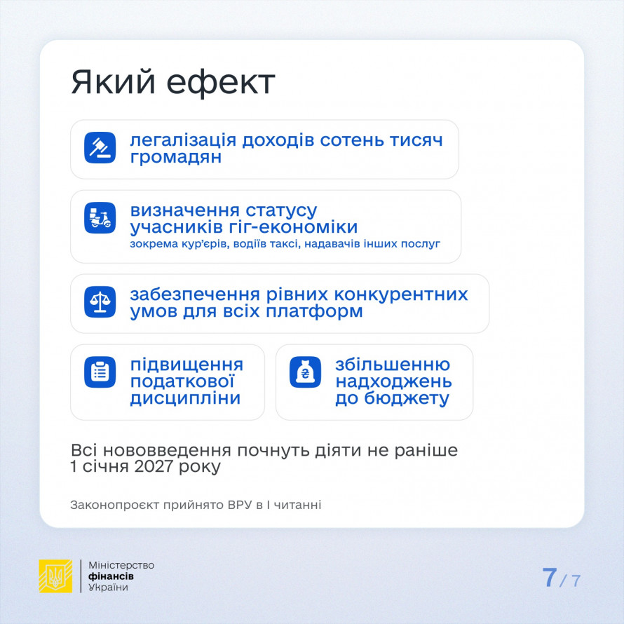 Реалізація положень законопроєкту стануть кроком до детінізації економіки, що дозволить Україні приєднатися до міжнародної системи обміну інформацією про доходи з цифрових платформ, а також підвищити прозорість цього ринку послуг.
